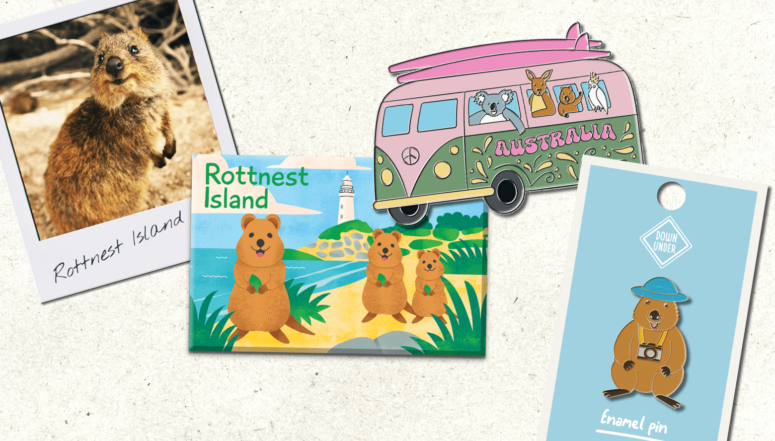 Our custom-designed collection for Rottnest Island celebrates the islands unique wildlife, showcasing adorable quokkas engaging in iconic Aussie activities.
